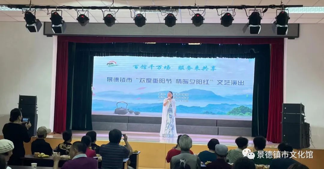 情暖桑榆,爱满重阳。为喜迎党的二十大胜利召开,弘扬中华民族敬老爱老的传统美德,积极培育和践行社会主义核心价值观,9月28日上午,“百馆千万场 服务来共享”2022江西省系列群众文化活动之“我们的节日”--景德镇市“欢度重阳节 情暖夕阳红”文艺演出在市文化馆五楼多功能厅浓情上演。演出在舞蹈《灯火里的中国》中拉开序幕,随后女声独唱《彩云之南》、歌伴舞《卓玛》、原创曲艺《鸡欢人笑满园春》等优秀的文艺节目轮番上演,精彩不断。舞台上下高度共鸣,演员观众融为一体,表现了浓浓的爱国情怀和孝老敬老情怀。