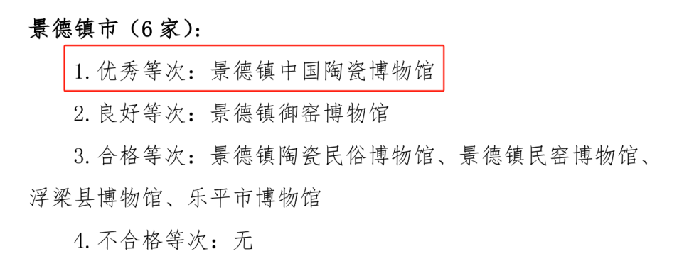 此次参加考评的共有131家国有博物馆纪念馆,考核评价优秀等次博物馆共20家,占比15.9%。在景德镇市6家参评博物馆中,景德镇中国陶瓷博物馆喜获“优秀”等次!