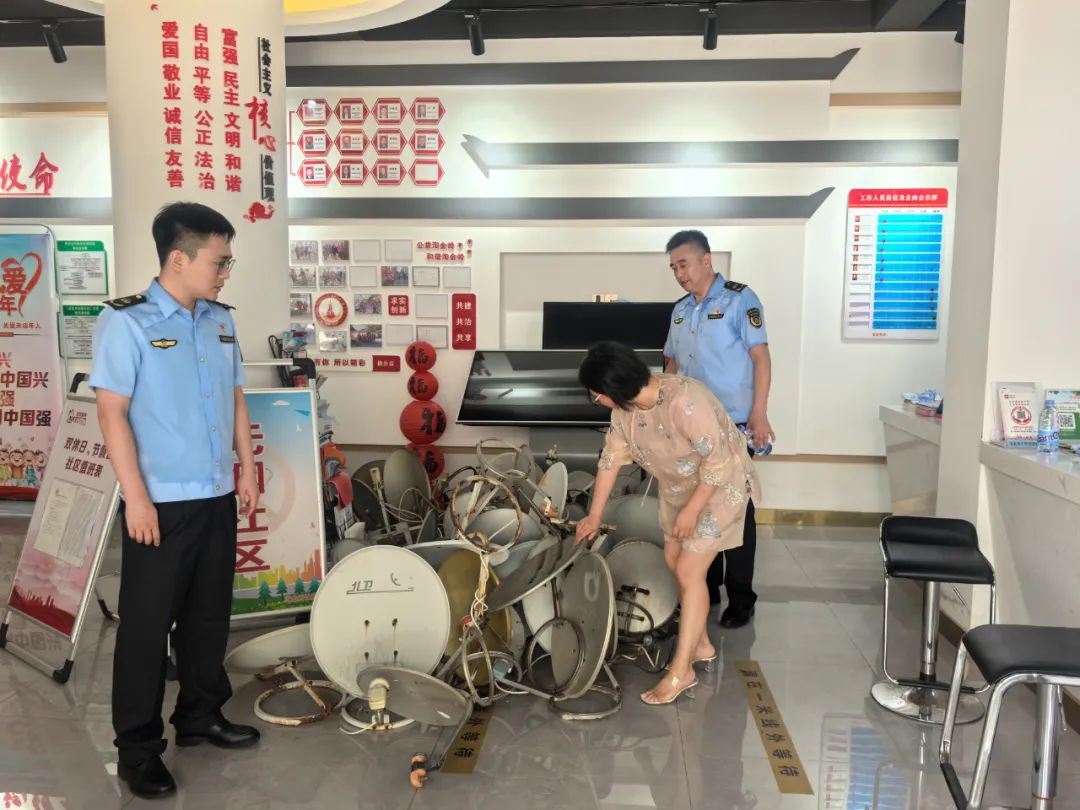 执法人员深入住宅小区,通过上门走访、实地巡查的方式,逐一排查,对是否存在违规接收境内、境外电视节目,是否擅自安装使用卫星电视广播地面接收设施设备等行为进行检查,共拆除非法安装卫星地面接受设施80个,并向群众宣传讲解《卫星电视广播地面接收设施管理规定》、《广播电视管理条例》等相关政策法规,发放宣传资料1000余份,进一步提高群众的知法遵法守法意识,呼吁群众自觉抵制相应行为,自行拆除非法卫星地面接收设施,提高法治意识。
